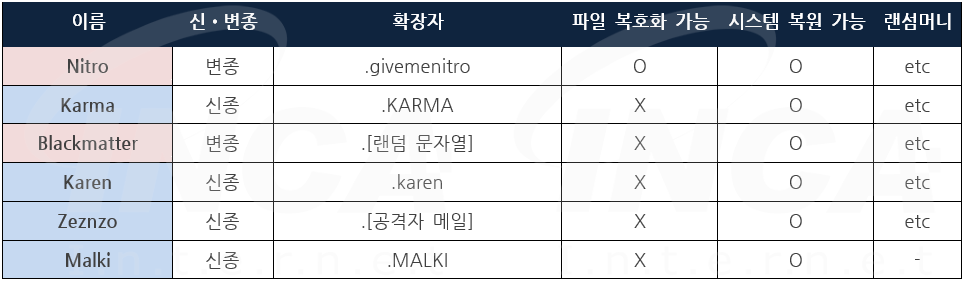 잉카인터넷 대응팀은 2021년 8월 13일부터 2021년 8월 19일까지 랜섬웨어 신•변종 및 이슈와 관련하여 대응을 진행하였으며, 신종 랜섬웨어는 "Karma" 외 3건, 변종 랜섬웨어는 "Nitro" 외 1건이 발견됐다.