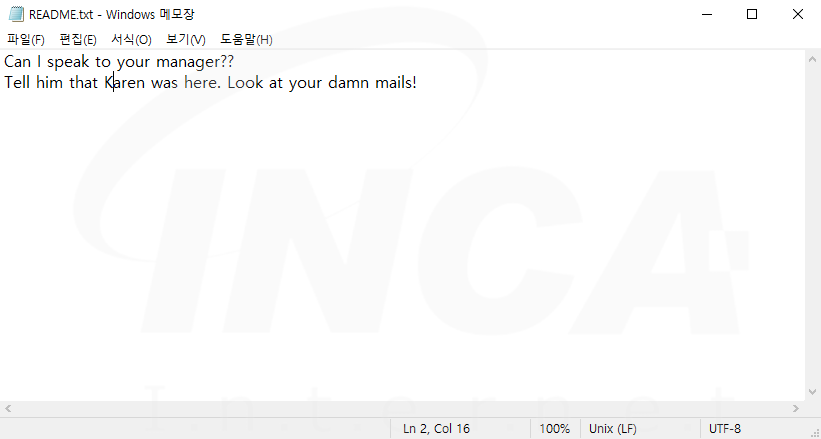 파일명에 ".karen" 확장자를 추가하고 "README.txt"라는 랜섬노트를 생성하는 "Karen" 랜섬웨어가 발견됐다. 해당 랜섬웨어는 공격자의 C&C 서버와 연결을 시도한다.