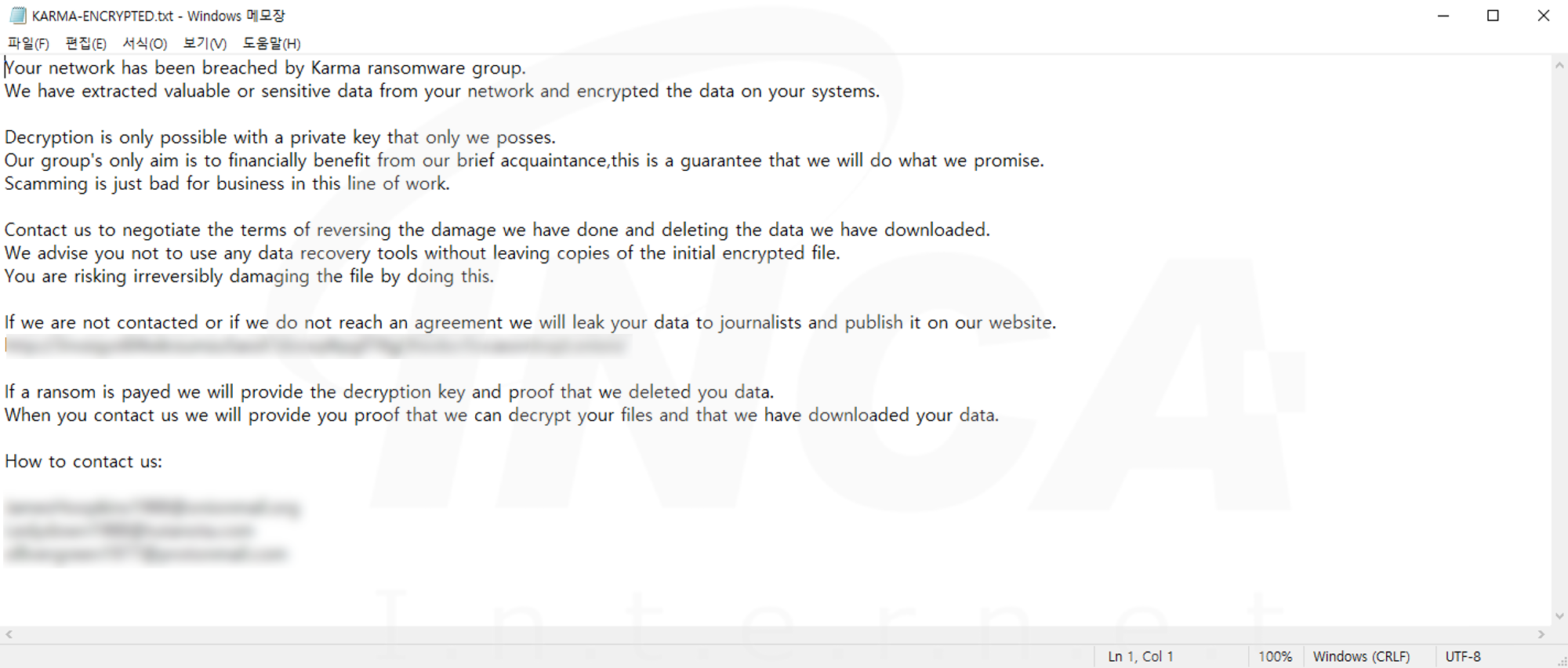 파일명에 ".KARMA" 확장자를 추가하고 "KARMA_ENCRYPTED.txt"라는 랜섬노트를 생성하는 "Karma" 랜섬웨어가 발견됐다. 해당 랜섬웨어는 공격자의 C&C 서버와 연결을 시도한다.