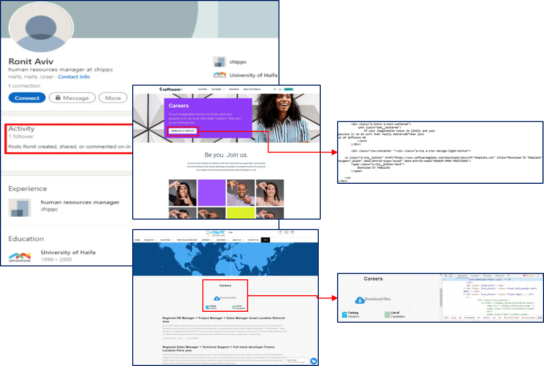 이번 캠페인을 진행한 APT 그룹은 특정 업체의 인사담당자를 사칭한 가짜 링크드인(LinkedIn) 프로필을 생성해 해당 프로필을 열람한 사용자들이 악의적으로 조작된 웹사이트로 접속하도록 유도했다. 이들이 위장한 사이트는 독일 소프트웨어 업체인 Software AG와 이스라엘 IT 업체 ChipPC로 사용자가 사이트에 접속해 다운로드 버튼을 클릭할 경우 악성 문서를 다운로드한다.