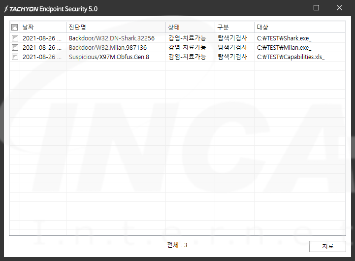 상기 악성코드는 잉카인터넷 안티바이러스 제품 TACHYON Internet Security 5.0에서 진단 및 치료가 가능하다.