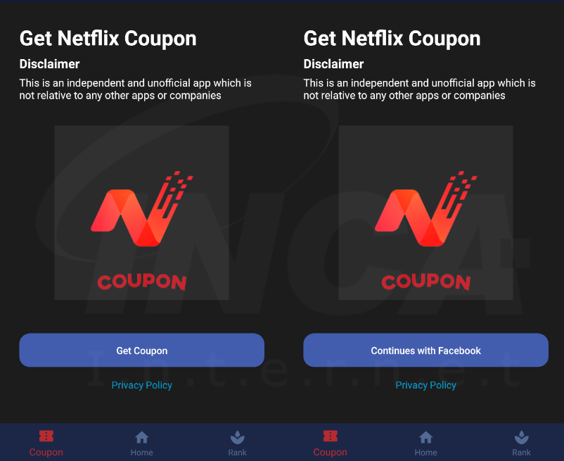 FlyTrap 은 무료 쿠폰 제공, 설문 조사 투표 앱, 등으로 위장한 후, 앱 기능을 이용하기 위해 사용자에게 Facebook 계정으로 접속할 것을 요구한다. 아래 앱은 평소에는 무료 Netflix 쿠폰을 제공하는 앱으로 위장하지만, C&C 서버로부터 명령을 받으면 Facebook 계정 접속 버튼이 활성화된다.