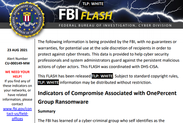 [2] FBI (2021.08.30) - Indicators of Compromise Associated with OnePercent Group Ransomware