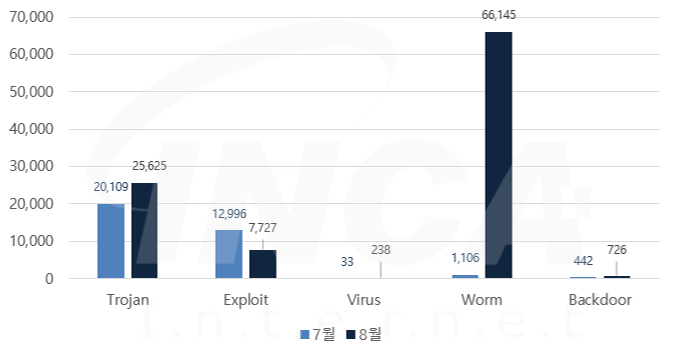 8월에는 악성코드 유형별로 7월과 비교하였을 때 Trojan, Virus, Worm 및 Backdoor의 진단 수가 증가하고, Exploit의 진단 수가 감소했다.