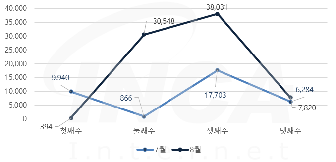 8월 한달 동안 악성코드 진단 현황을 주 단위로 살펴보았을 때 7월에 비해 증가한 추이를 보이고 있다.