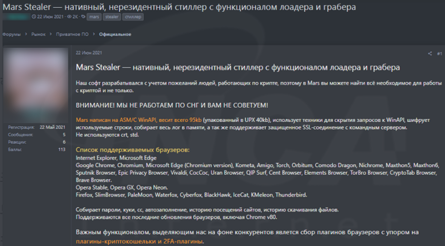 해커 포럼에 러시아어로 작성된 악성코드 판매글이 게시됐다. 해당 글의 게시자는 "Mars" 악성코드를 140달러에 판매하고 있으며 관련 정보와 함께 탈취한 정보를 관리할 수 있는 패널의 이미지를 게시했다. 해당 악성코드는 사용자 PC의 언어를 확인해 해당 언어가 중앙 아시아 및 러시아라면 프로세스를 종료하며 최종적으로 브라우저, 암호화폐 지갑 및 시스템 정보 등 다양한 정보를 탈취해 공격자의 서버로 전송한다.
