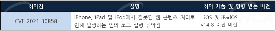 Apple 사는 제품에서 발생하는 취약점에 대한 보안 업데이트를 발표하고, 관련 취약점을 해결하기 위해 최신 버전으로 업데이트할 것을 권고하였다.