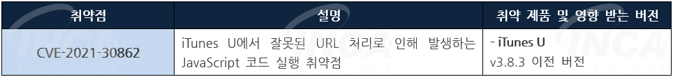Apple 사는 제품에서 발생하는 취약점에 대한 추가 보안 업데이트를 발표하고, 관련 취약점을 해결하기 위해 최신 버전으로 업데이트할 것을 권고하였다.
