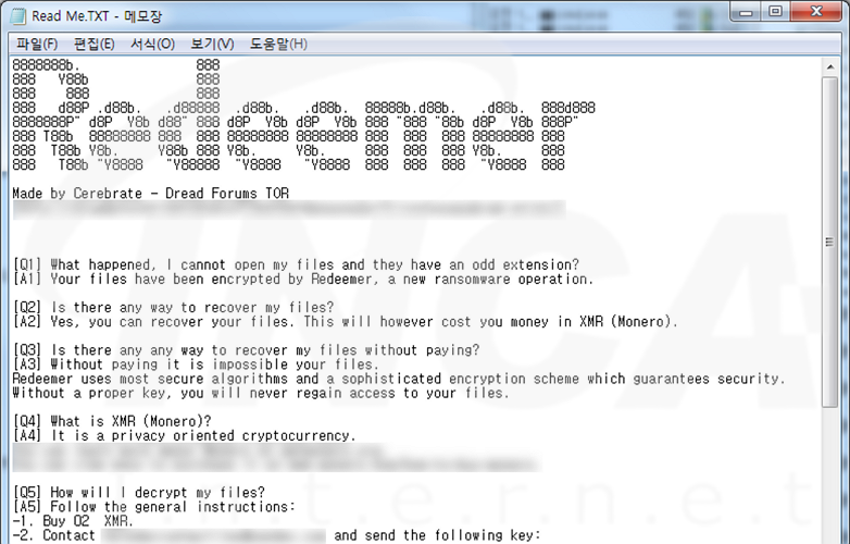 파일명에 “.redeem” 확장자를 추가하고 “Read Me.txt”라는 랜섬노트를 생성하는 “Redeemer” 랜섬웨어가 발견됐다. 해당 랜섬웨어는 시스템 복원을 무력화한다.