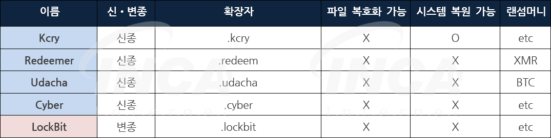 잉카인터넷 대응팀은 2021년 9월 17일부터 2021년 9월 23일까지 랜섬웨어 신•변종 및 이슈와 관련하여 대응을 진행하였으며, 신종 랜섬웨어는 "Kcry"외 3건, 변종 랜섬웨어는 "LockBit" 1건이 발견됐다.