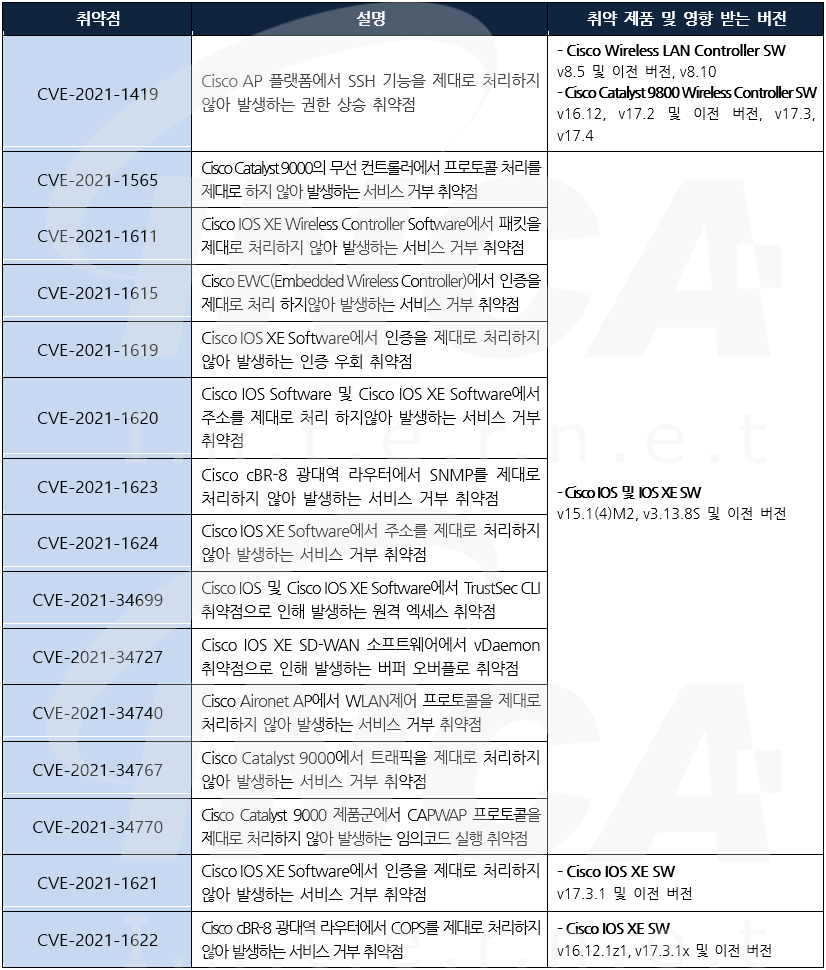 Cisco 사는 제품에서 발생하는 취약점에 대한 보안 업데이트를 발표하고, 관련 취약점을 해결하기 위해 최신 버전으로 업데이트할 것을 권고하였다.