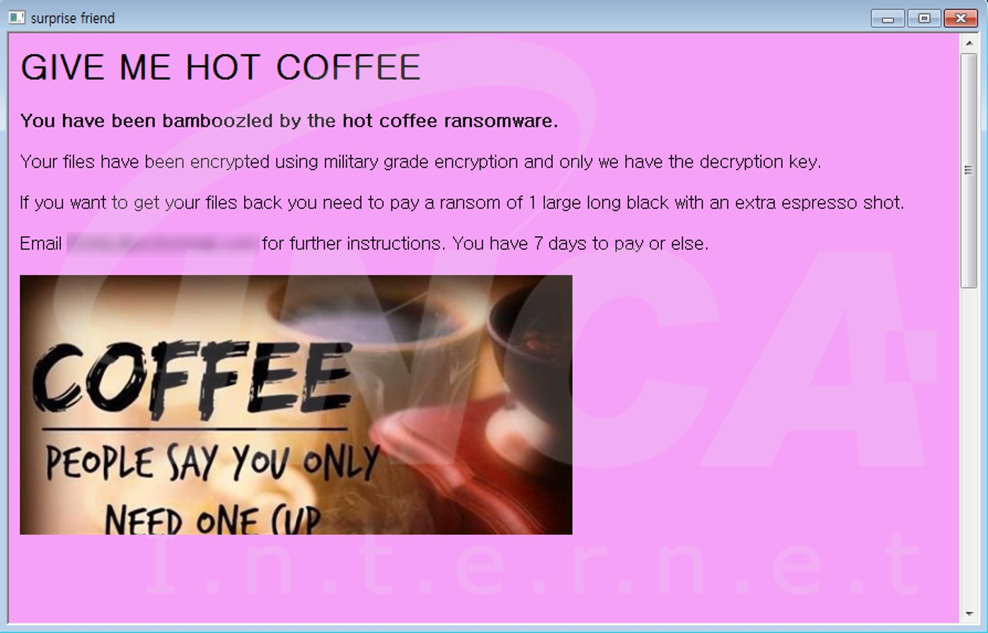파일명에 ".hotcoffee" 확장자를 추가하고 "HOT_COFFEE_README.txt"라는 랜섬노트를 생성하는 "HotCoffee" 랜섬웨어가 발견됐다.