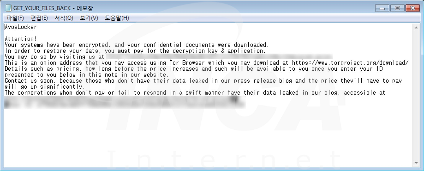 파일명에 ".avos2" 확장자를 추가하고 "GET_YOUR_FILES_BACK.txt"라는 랜섬노트를 생성하는 "AvosLocker" 랜섬웨어의 변종이 발견됐다.