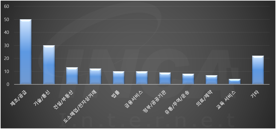 2021년 9월(9월 1일 ~ 9월 30일)에 발생한 데이터 유출 건을 산업별로 비교하였을 때 제조/공급 분야가 가장 많은 공격을 받았고, 기술/통신 분야 및 건설/부동산 분야가 그 뒤를 따랐다.