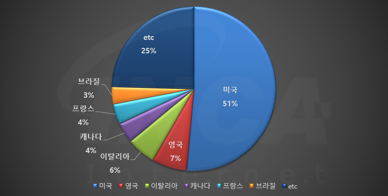 2021년 9월(9월 1일 ~ 9월 30일)에 발생한 데이터 유출 건을 국가별로 비교하였을 때 미국이 51%로 가장 높은 비중을 차지했고, 영국과 이탈리아가 각각 7%와 6%, 캐나다와 프랑스가 4%로 그 뒤를 따랐다.