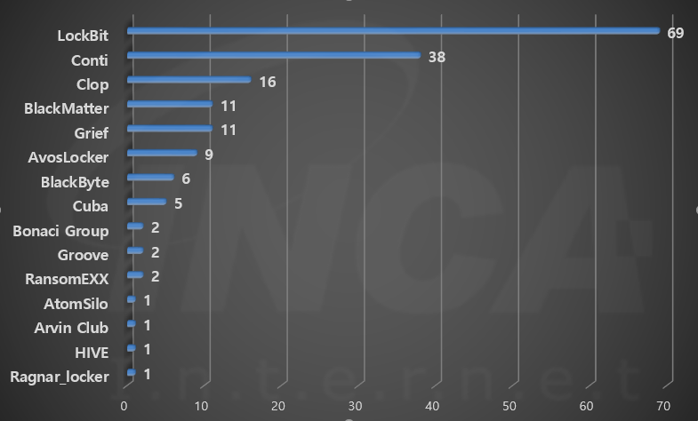 2021년 9월(9월 1일 ~ 9월 30일)에 발생한 데이터 유출 현황을 랜섬웨어 진단명 별로 비교하였을 때 "LockBit" 랜섬웨어가 69건으로 가장 많은 데이터 유출이 있었고, "Conti" 랜섬웨어가 38건으로 두번째로 많이 발생했다.