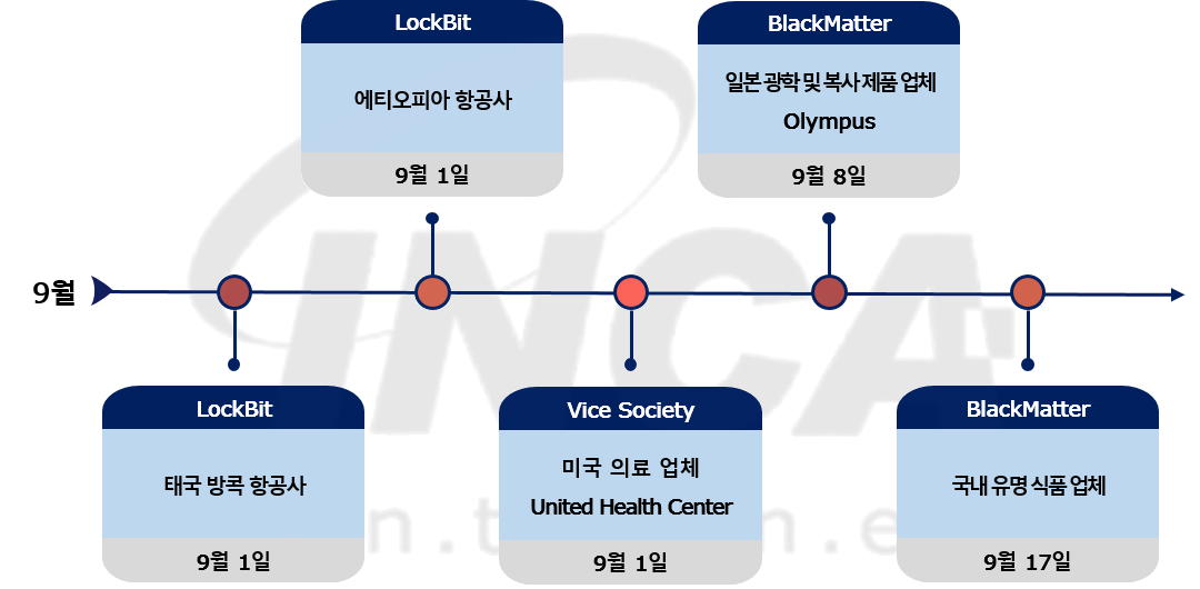 2021년 9월(9월 1일 ~ 9월 30일) 한 달간 랜섬웨어 동향을 조사한 결과, 태국의 방콕 항공사와 에티오피아 항공사가 "LockBit" 랜섬웨어의 공격을 당했고, "Vice Society" 랜섬웨어가 미국의 의료 업체 United Health Center를 공격했다. 또한, 일본 광학 및 복사 제품 업체 Olympus와 국내 유명 식품 업체가 "BlackMatter" 랜섬웨어의 공격을 받은 사건이 있었다.