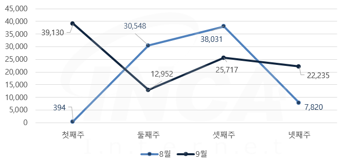 9월 한달 동안 악성코드 진단 현황을 주 단위로 살펴보았을 때 8월에 비해 증가한 추이를 보이고 있다.