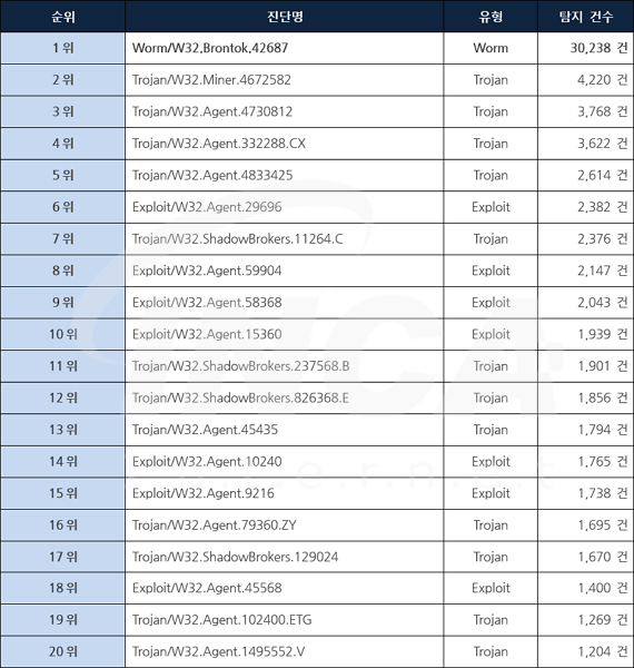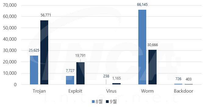 9월에는 악성코드 유형별로 8월과 비교하였을 때 Trojan, Exploit 및 Virus의 진단 수가 증가하고, Worm 및 Backdoor의 진단 수가 감소했다.