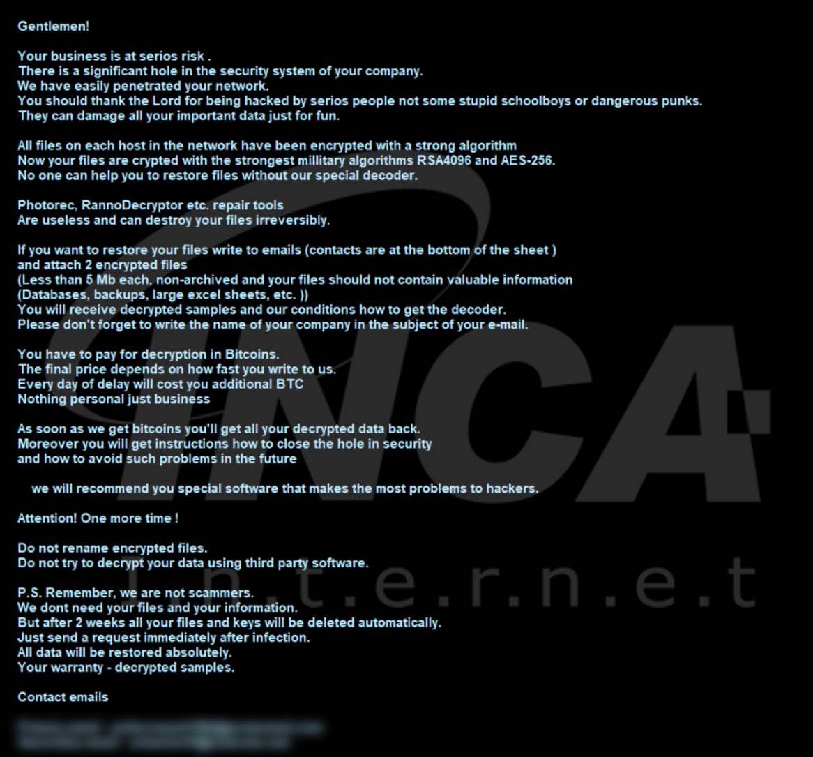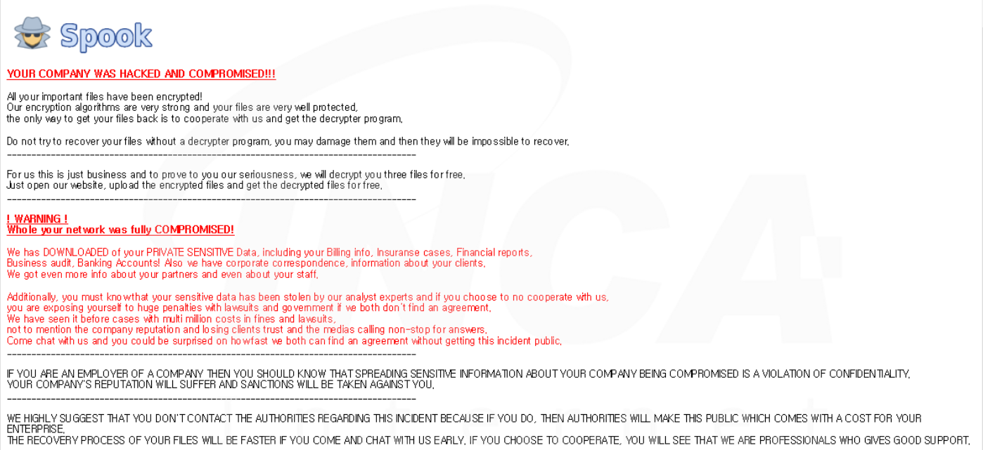 파일명에 ".PUUEQS8AEj" 확장자를 추가하고 "RESTORE_FILES_INFO.hta"라는 랜섬노트를 생성하는 "Spook" 랜섬웨어가 발견됐다. 해당 랜섬웨어는 시스템 프로세스를 제외한 다수의 프로세스를 종료한다.