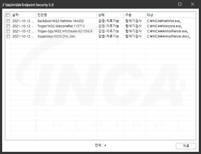 상기 악성코드는 잉카인터넷 안티바이러스 제품 TACHYON Internet Security 5.0에서 진단 및 치료가 가능하다.