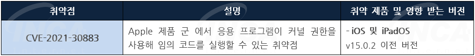 Apple 사는 제품에서 발생하는 취약점에 대한 추가 보안 업데이트를 발표하고, 관련 취약점을 해결하기 위해 최신 버전으로 업데이트할 것을 권고하였다.