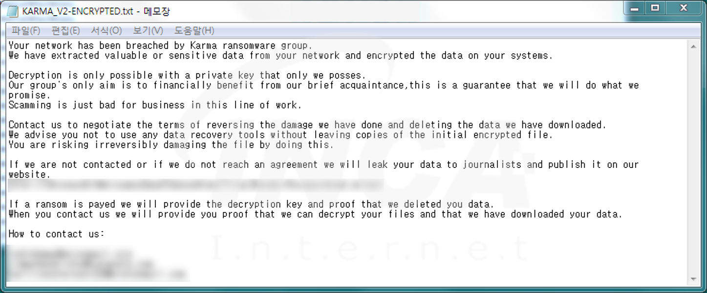 파일명에 “.KARMA_V2” 확장자를 추가하고 “KARMA_V2-ENCRYPTED.txt”라는 랜섬노트를 생성하는 “Karma” 랜섬웨어가 발견됐다.