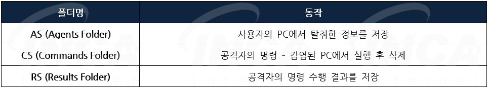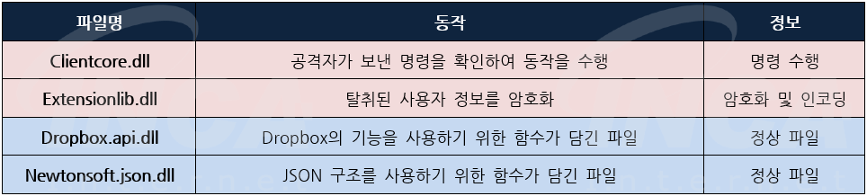 '4.0' 이전 버전은 공격자의 명령이 단순히 명령 프롬프트나 파워쉘을 실행하여 동작을 수행했다면 '4.0' 버전부터는 "Clientcore.dll"에 함수로 저장되어 있어 [표 4]와 같은 동작을 수행한다.