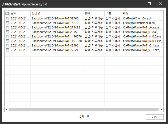 상기 악성코드는 잉카인터넷 안티바이러스 제품 TACHYON Internet Security 5.0에서 진단 및 치료가 가능하다.