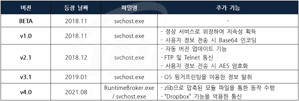 해당 악성코드는 코드 내부에 버전 정보가 저장되어 있으며 2018년에 처음 등장한 것으로 추정된다. 현재까지 지속적인 버전 패치를 통해 2021년 10월에 ‘4.0’ 버전까지 출시된 것으로 확인된다.