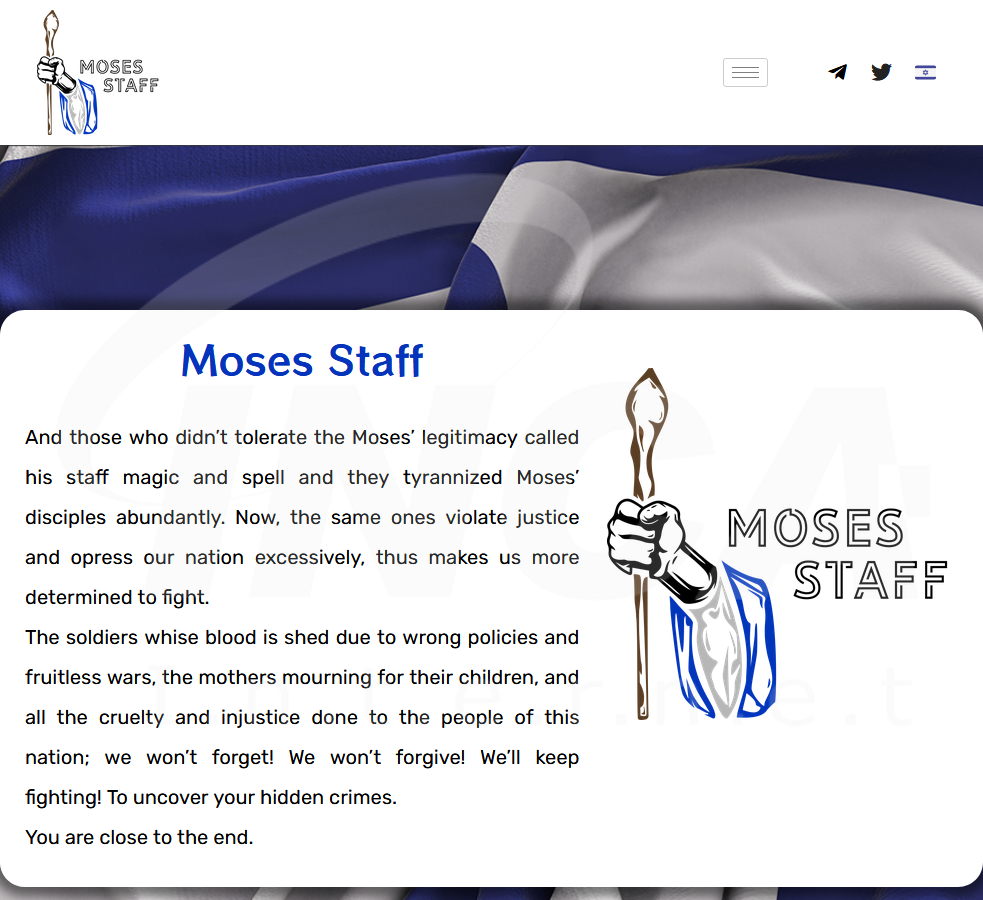 "Moses Staff" 사이트의 홈 화면에는 팔레스타인을 과도하게 억압하는 무리에 대항해 싸우기로 결심했다는 내용이 담겨있으며 주로 이스라엘 정부와 관련된 기업에서 탈취한 데이터가 게시돼 있다.