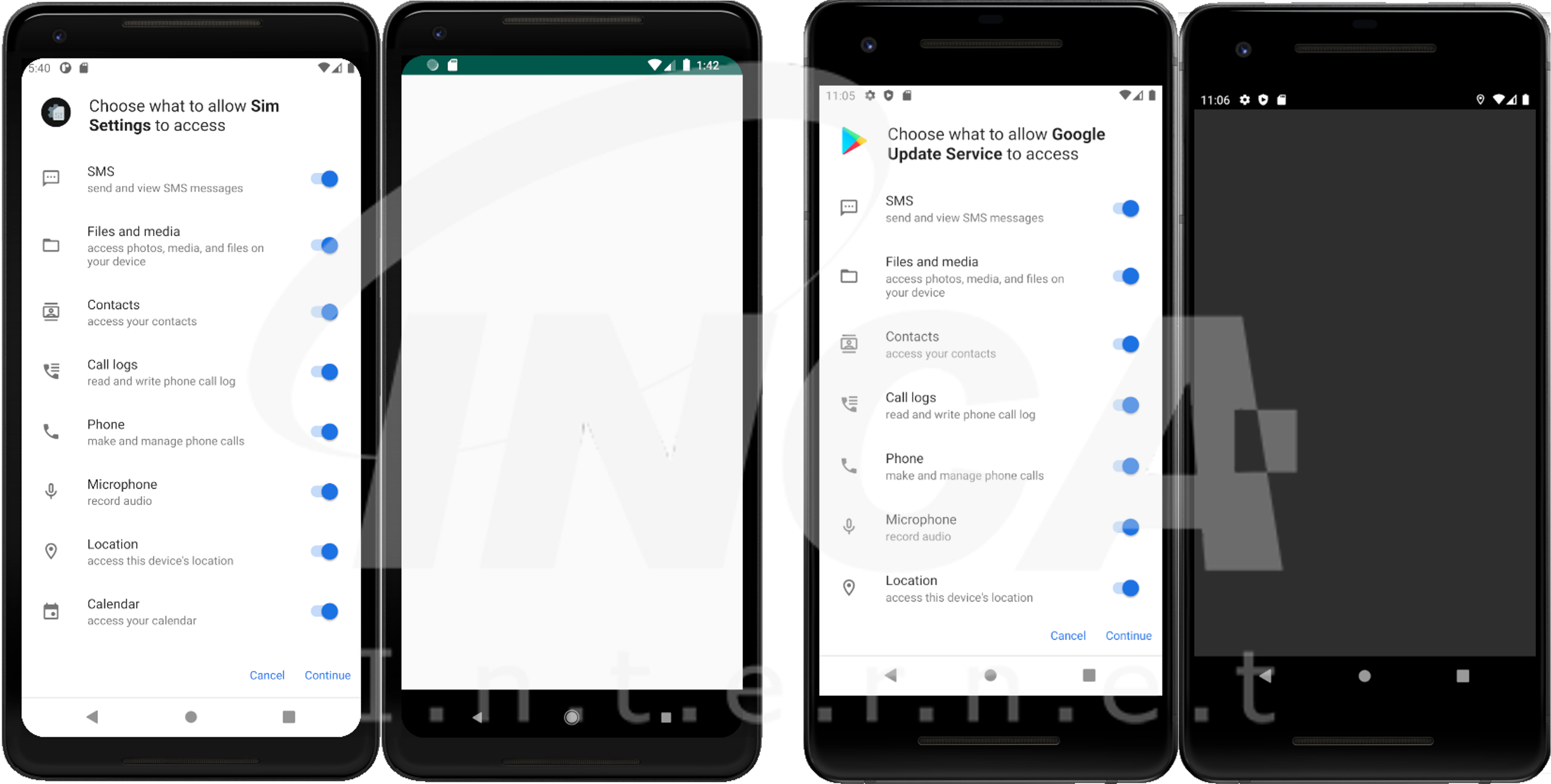 앱을 실행하면 아래의 이미지와 같이, 각종 권한을 획득한 다음 아무런 화면도 띄우지 않지만, 각종 악성 동작이 수행된다.