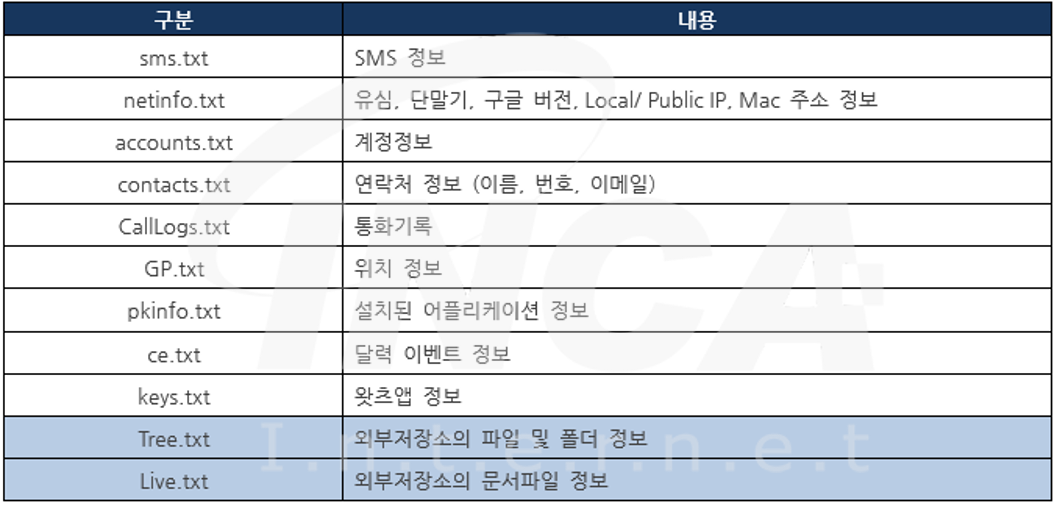 해당 악성코드는 단말기의 유심 정보를 포함하여 사용자의 개인정보가 포함되어있는 연락처, 통화기록, 문자메시지 등의 정보를 탈취한다. 그리고 아래의 표와 같이, 최근 변종은 외부저장소에 저장되어있는 일부 파일의 정보를 획득하는 동작이 추가되었다.