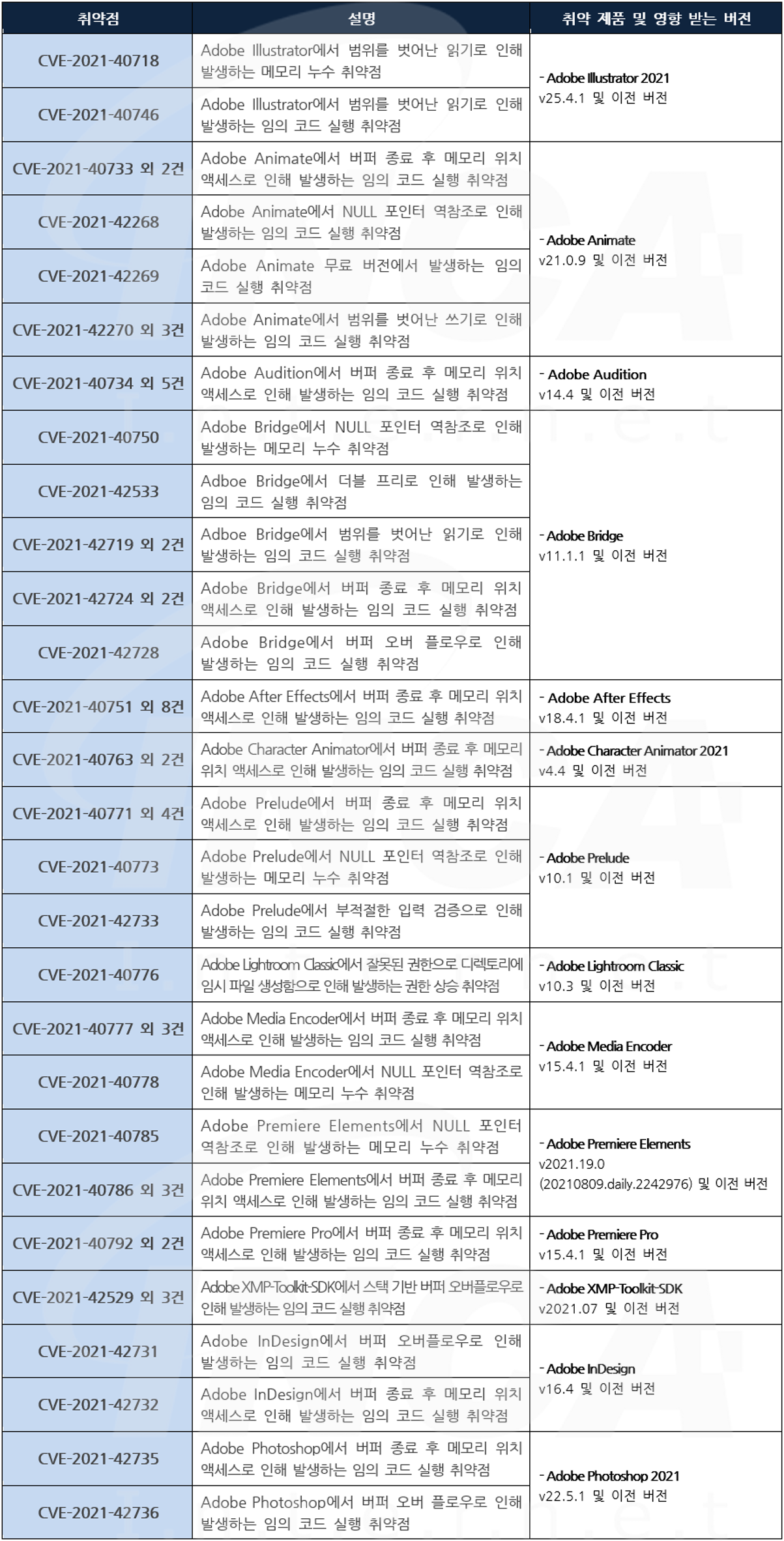 Adobe 사는 제품에서 발생하는 취약점에 대한 보안 업데이트를 발표하고, 관련 취약점을 해결하기 위해 최신 버전으로 업데이트할 것을 권고하였다.