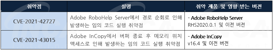 Adobe 사는 제품에서 발생하는 취약점에 대한 보안 업데이트를 발표하고, 관련 취약점을 해결하기 위해 최신 버전으로 업데이트할 것을 권고하였다.