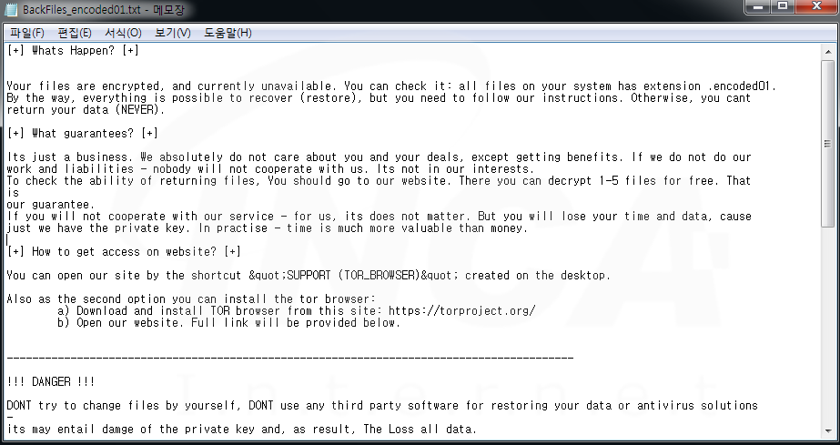 파일명에 ".encoded01" 확장자를 추가하고 "BackFiles-encoded01.txt"라는 랜섬노트를 생성하는 "Enc" 랜섬웨어가 발견됐다.