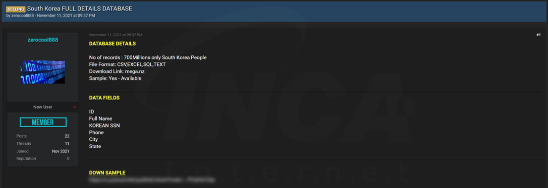 최근, 러시아어를 사용하는 다크웹 포럼에 한국인 개인정보 판매글이 게시됐다. 판매자는 7억건의 개인정보를 판매한다고 언급하며 판매하는 데이터에 ID, 이름, 주민등록번호 및 휴대폰 번호 등의 주요 개인정보가 있다고 밝혔다.