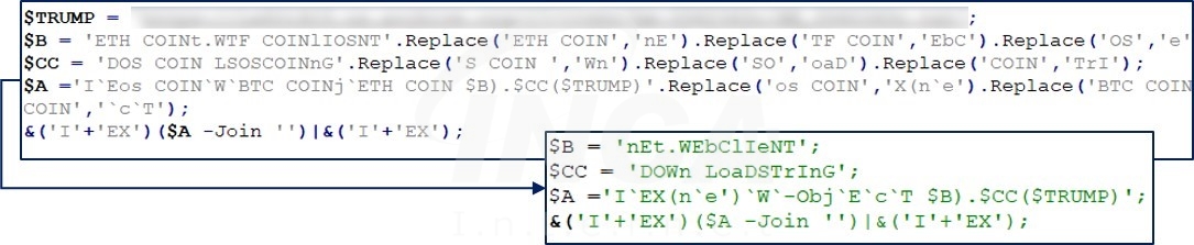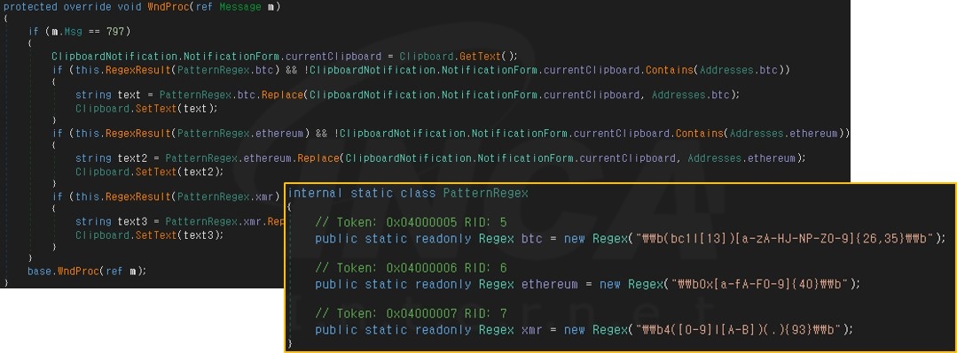 Water Basilisk 캠페인에서 사용하는 최종 페이로드는 HCrypt로 생성 가능한 “NjRat” 등의 악성코드와 코인 스틸러가 있다. 이번 캠페인에서 사용된 악성코드 중 코인 스틸러는 [그림 9]와 같이 비트코인, 이더리움 및 모네로 코인을 탈취한다.