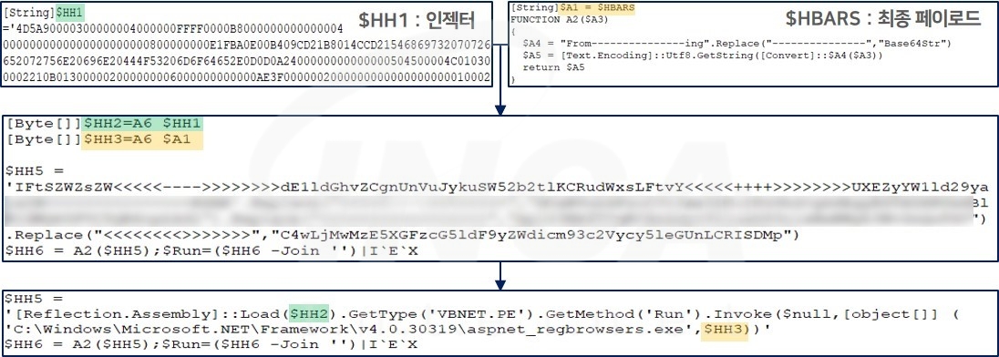 또한, 최종 페이로드 실행을 위해 스크립트의 난독화를 해제하고 ASP.NET 브라우저 등록 도구인 aspnet- regbrowsers.exe 프로세스에 최종 페이로드를 인젝션한다.