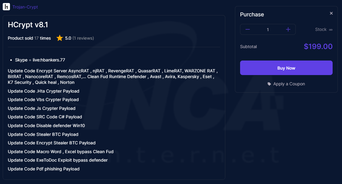 현재 최신 버전인 v8.1이 199 달러에 판매 중이며, “NjRat” 외 8종의 RAT 악성코드의 암호화를 지원한다.