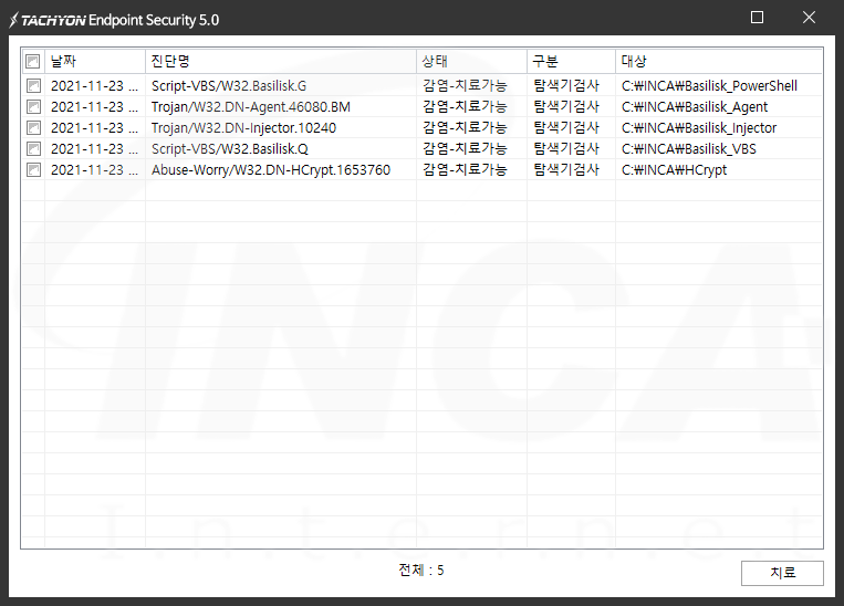 상기 악성코드는 잉카인터넷 안티바이러스 제품 TACHYON Internet Security 5.0에서 진단 및 치료가 가능하다.