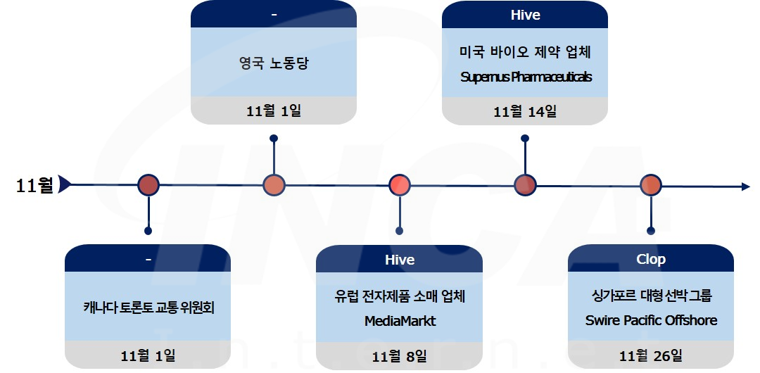 2021년 11월(11월 1일 ~ 11월 30일) 한 달간 랜섬웨어 동향을 조사한 결과, 캐나다 토론토 교통 위원회와 영국 노동당에서 사이버 공격을 받은 정황이 발견됐다. 또한, 유럽 전자제품 소매 업체 MediaMarkt과 미국 바이오 제약 업체 Supernus Pharmaceuticals가 "Hive" 랜섬웨어의 공격을 당했다. 추가로 싱가포르의 대형 선박 그룹 Swire Pacific Offshore(SPO)가 "Clop" 랜섬웨어의 공격을 받은 사건이 있었다.