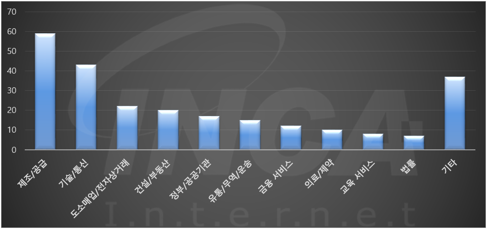 2021년 11월(11월 1일 ~ 11월 30일)에 발생한 데이터 유출 건을 산업별로 비교하였을 때 제조/공급 분야가 가장 많은 공격을 받았고, 기술/통신 분야 및 도소매업/전자상거래 분야가 그 뒤를 따랐다.