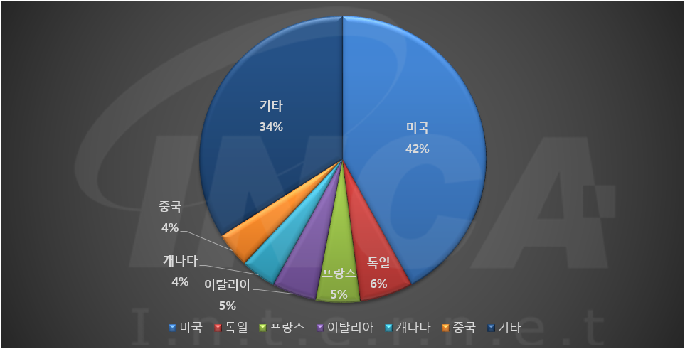 2021년 11월(11월 1일 ~ 11월 30일)에 발생한 데이터 유출 건을 국가별로 비교하였을 때 미국이 42%로 가장 높은 비중을 차지했고, 독일이 6%, 프랑스와 이탈리아가 5%로 그 뒤를 따랐다.